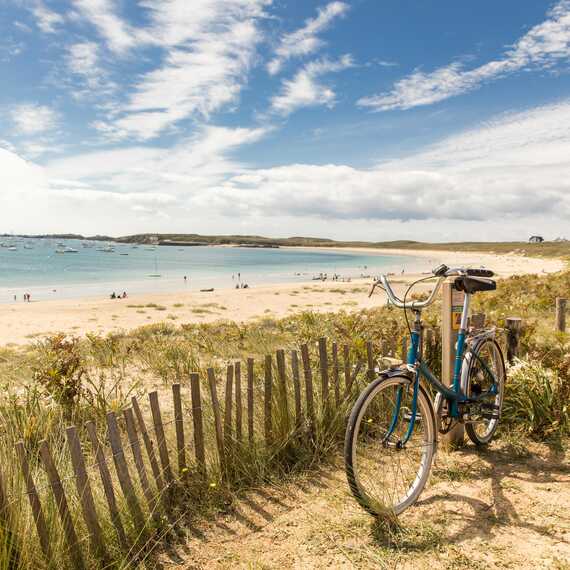 Pour découvrir l'île, empruntez les 40 km de chemins en vélo. Le vélo est le moyen de transport idéal sur l'île pour se faufiler dans les ruelles des villages et découvrir les chemins intérieurs. Quelques sites remarquables à ne pas manquer : la chapelle St-Leonard, le Port St Nicolas, le Trou de l'enfer, la Pointe des Chats, les Grands Sables et les Sables Rouges.