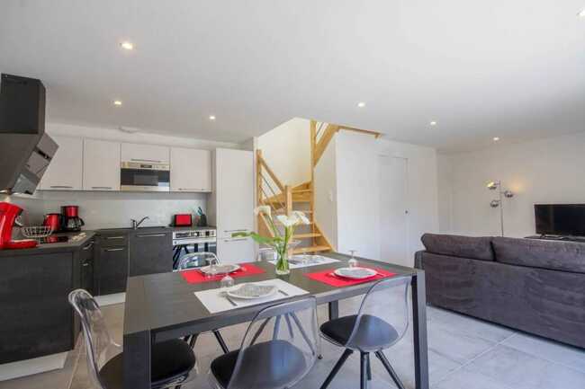 - Au rez de chaussée : Une entrée avec placard, une pièce de vie lumineuse avec cuisine équipée (four,micro onde, frigidaire, boulloire, machine à café filtre et dosettes, un grille pain, lave vaisselle, robot de cuisine ...) un salon séjour, une buanderie avec lave linge et lave vaisselle, un WC séparé avec lave mains.